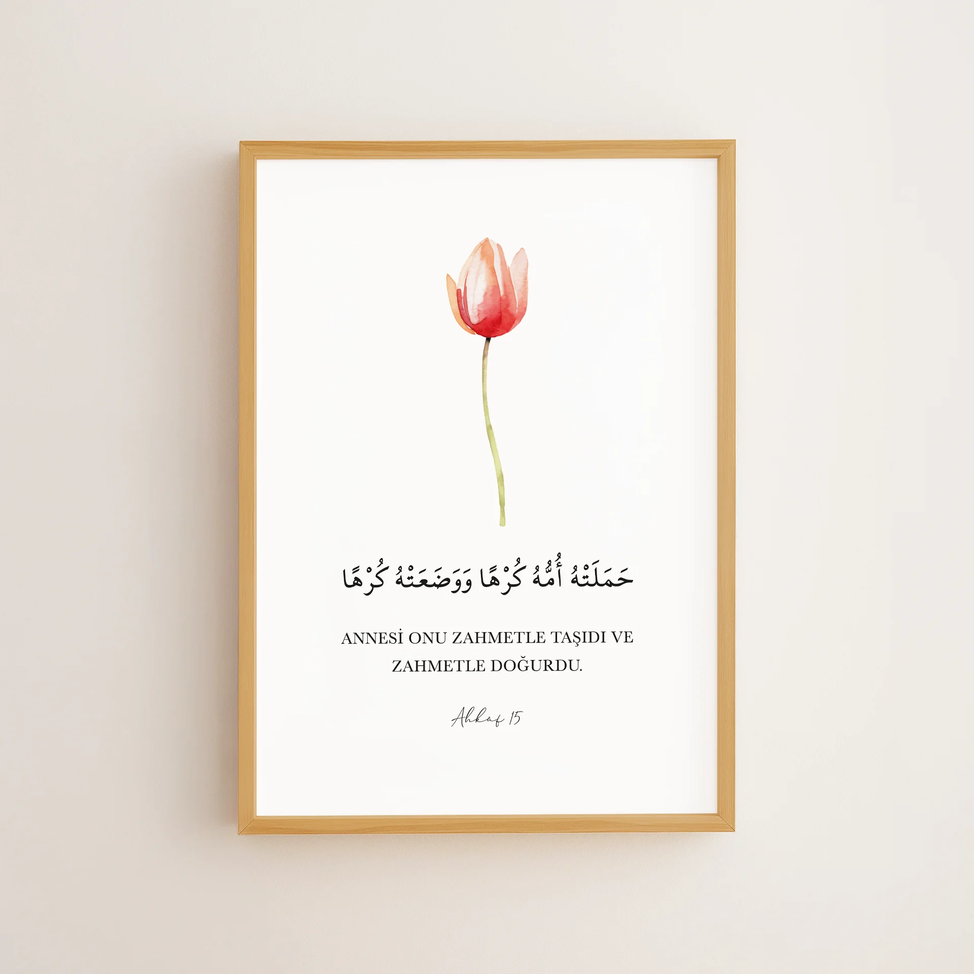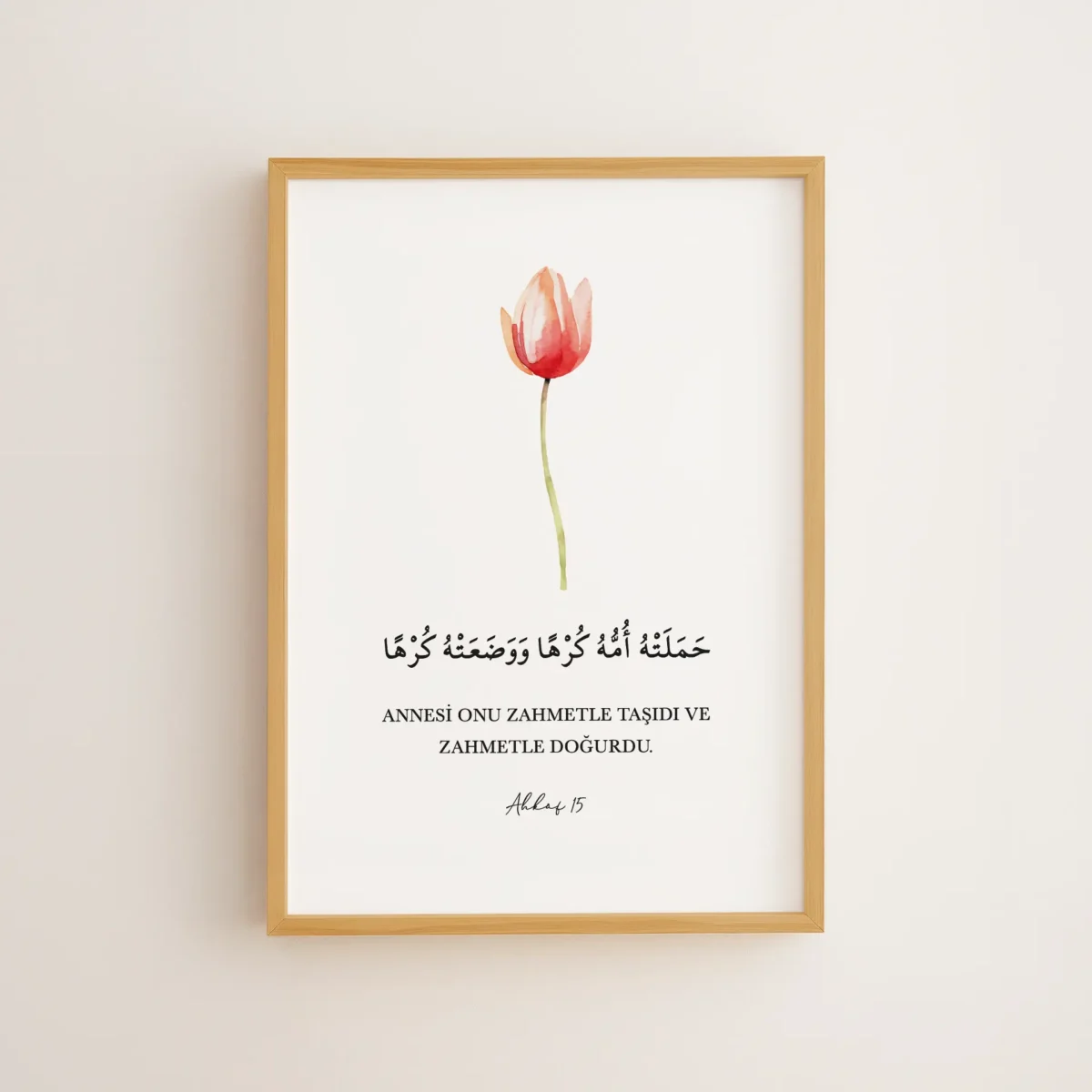 “Annesi onu zahmetle taşıdı ve zahmetle doğurdu” ayetini, canlı ve narin bir lale çizimiyle buluşturan bu tasarım, çerçeveli tablo veya poster olarak sunulur.