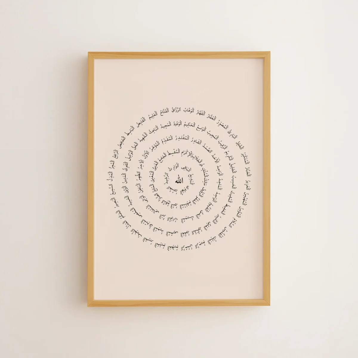 Allah’ın 99 ismini modern tipografiyle yansıtan tasarım, çerçeveli tablo veya poster olarak sunulur.