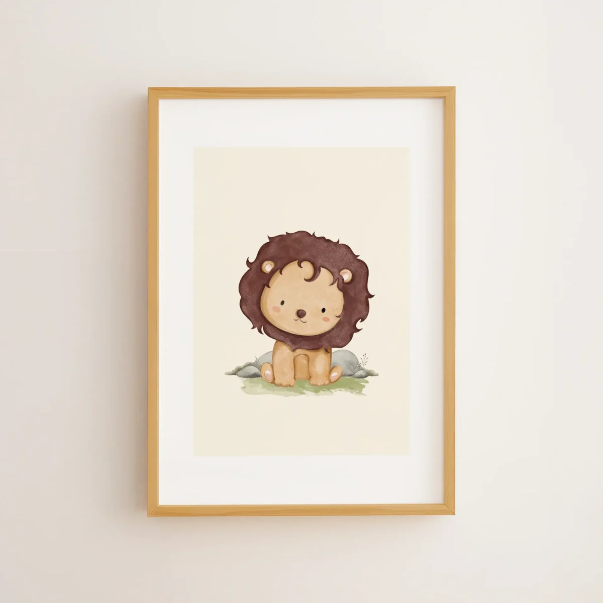 Aslan Kardeş, pastel renkli dost canlısı duruşuyla çocuk odalarına neşe katar; çerçeveli tablo veya poster olarak duvarlarınıza eşlik eder.