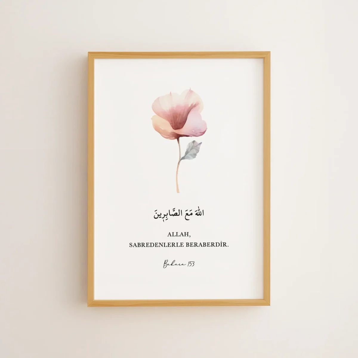 Bakara 153, “Allah, sabredenlerle beraberdir” ayetini zarif bir çiçekle buluşturur. Çerçeveli tablo veya poster olarak, sabır ve huzur hissini yaşam alanınıza taşır.