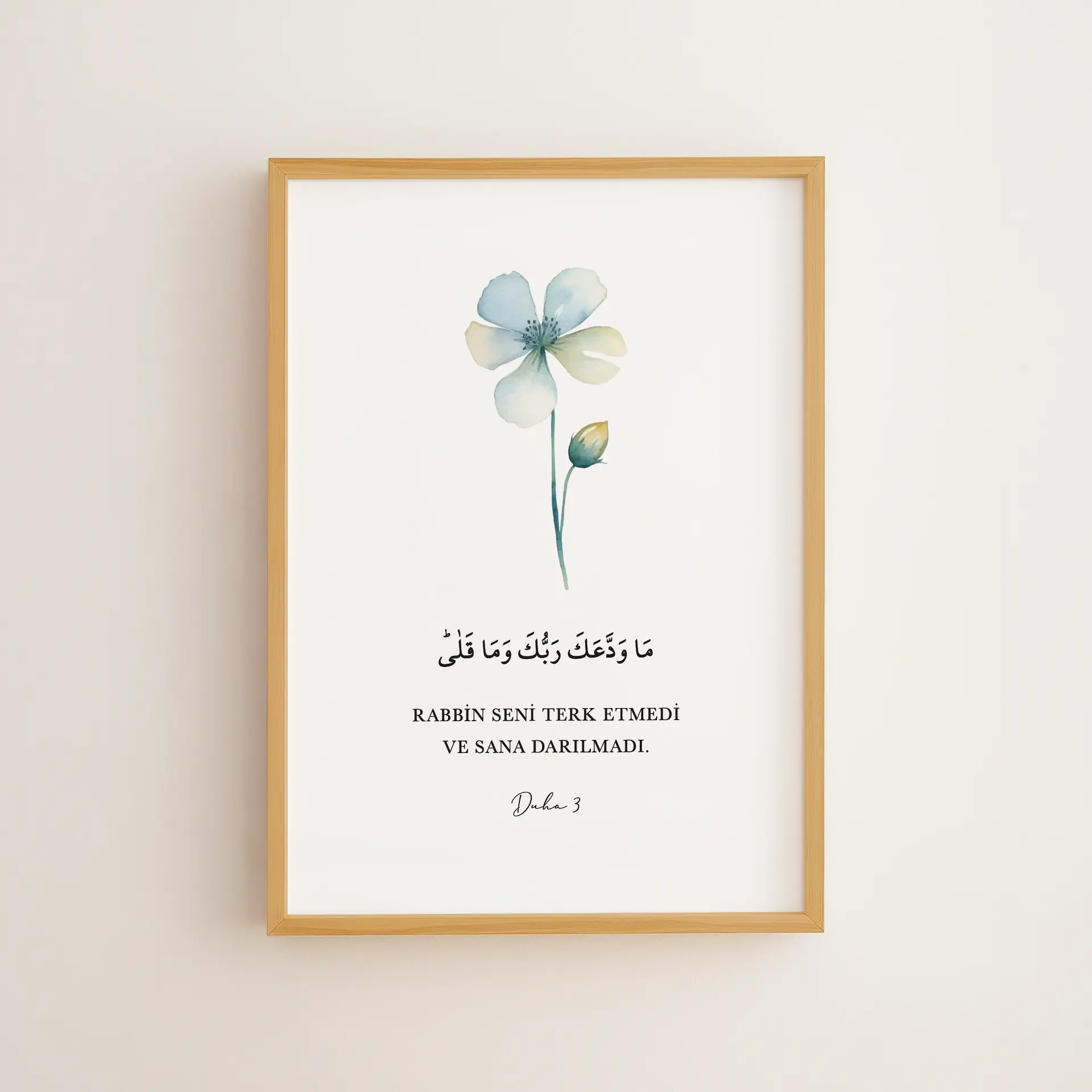 Duhâ 3, “Rabbin seni terk etmedi ve sana darılmadı” ayetini su renkli, nazik bir çiçekle buluşturur. Çerçeveli tablo veya poster olarak, güven ve merhamet hissini yaşam alanınıza taşır.