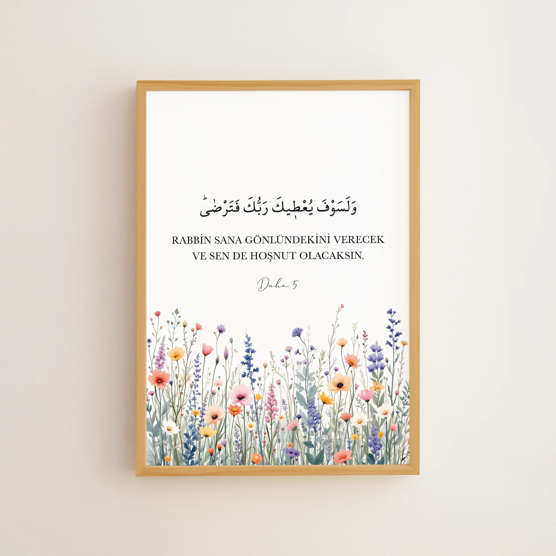Pastel çiçeklerin huzurlu tazeliğiyle “Rabbin sana gönlündekini verecek ve sen de hoşnut olacaksın” ayetini zarif bir dokunuşla sunar. Çerçeveli tablo veya poster olarak umut ve mutluluğu yansıtır.