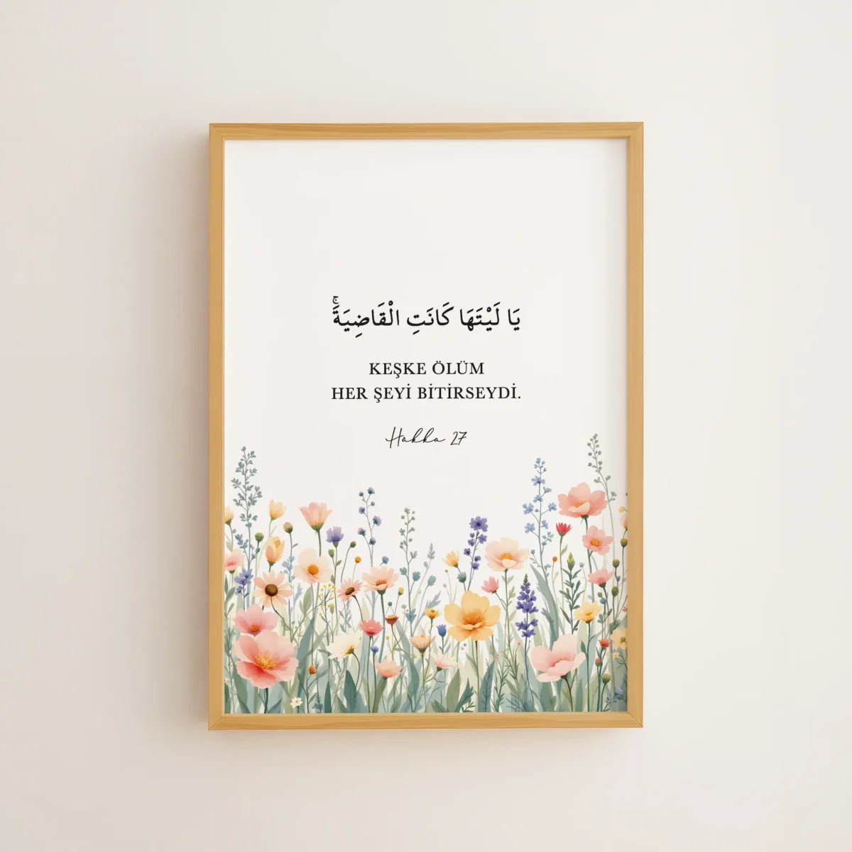 Pastel çiçekler, “Keşke ölüm her şeyi bitirseydi” ayetini derin bir duygu ve düşünceyle yansıtır. Çerçeveli tablo veya poster olarak ince bir tefekküre davet eder.