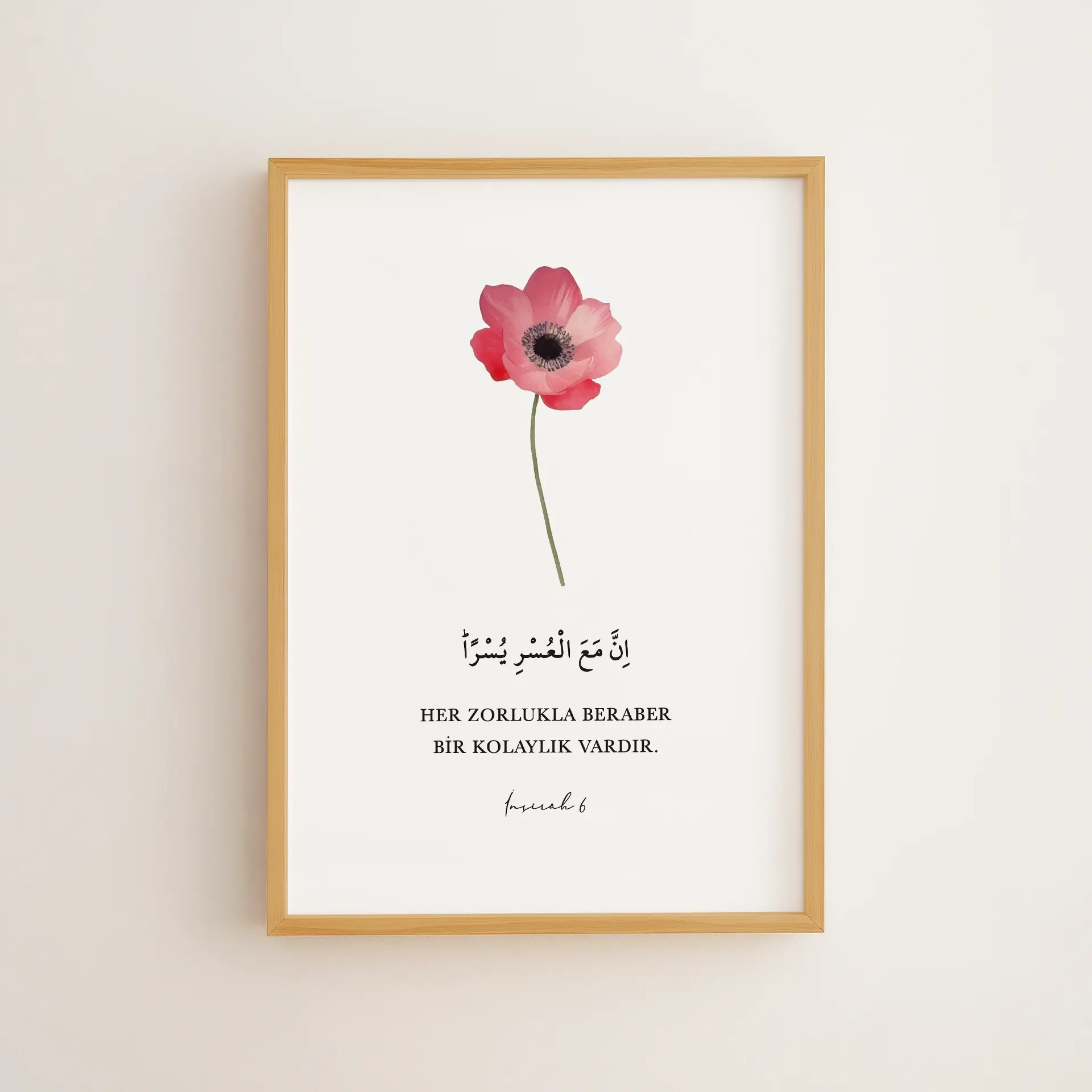 İnşirah 6, “Her zorlukla beraber bir kolaylık vardır” ayetini canlı pembe bir çiçekle birleştirir. Çerçeveli tablo veya poster olarak, umudun ve ferahlığın hayatın her anında var olduğunu hatırlatır.