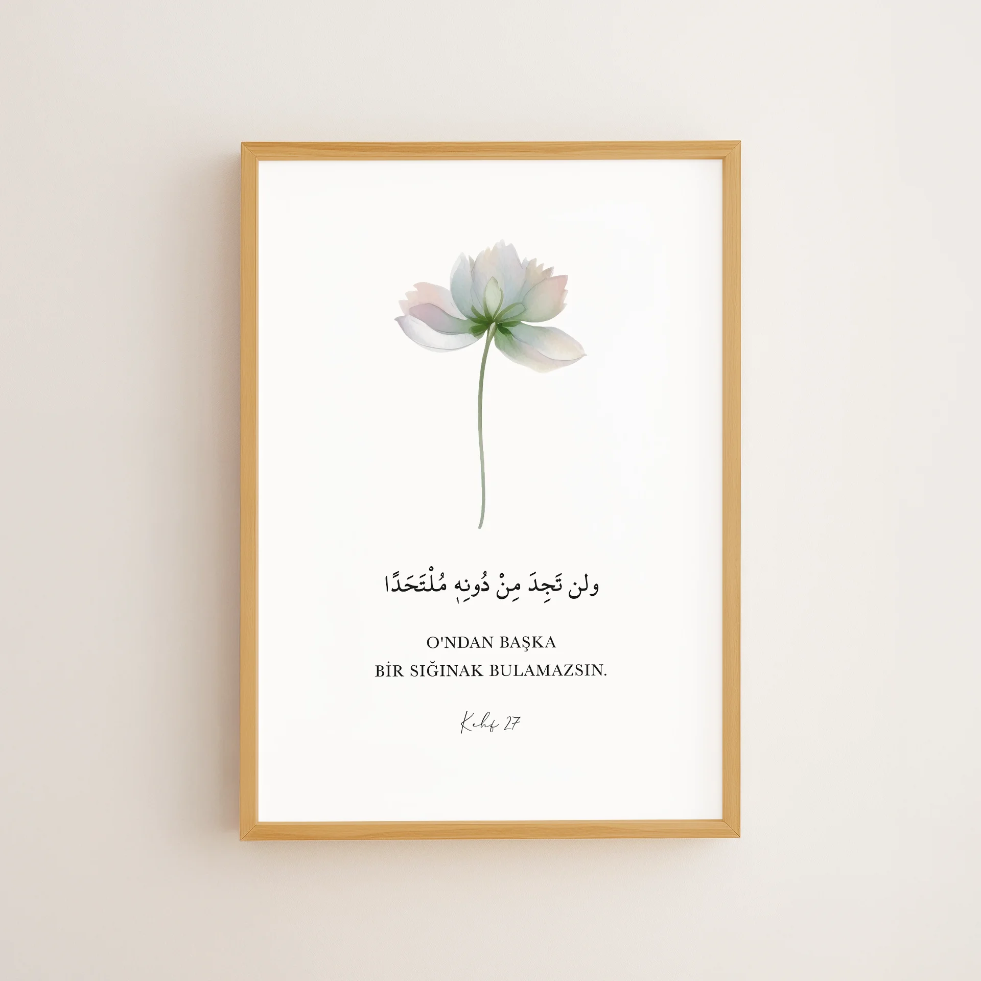 Kehf 27, “O’ndan başka bir sığınak bulamazsın” ayetini pastel tonlardaki zarif bir çiçekle bütünleştirir. Çerçeveli tablo veya poster olarak, manevi bir hatırlatma ve sakinlik duygusu sunar.