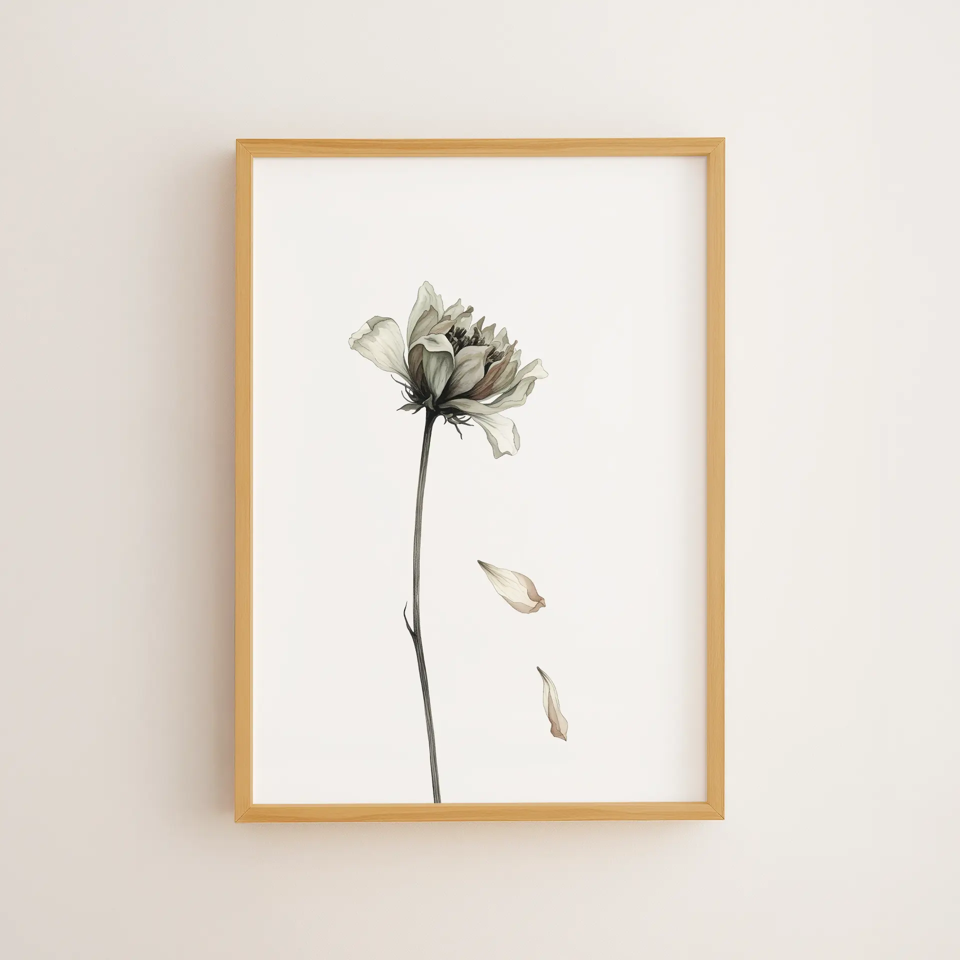 Kurumuş Çiçek, solup dökülen yaprakların hüzünlü zarafetini yansıtır. Çerçeveli tablo veya poster olarak, hayatın geçiciliğini ve anıların değerini duvarlarınıza taşır.