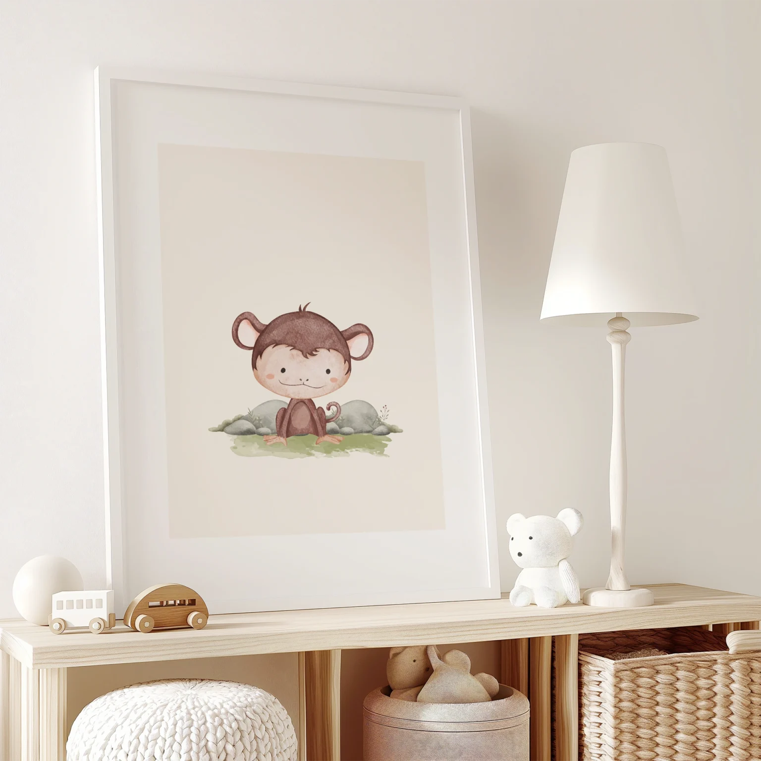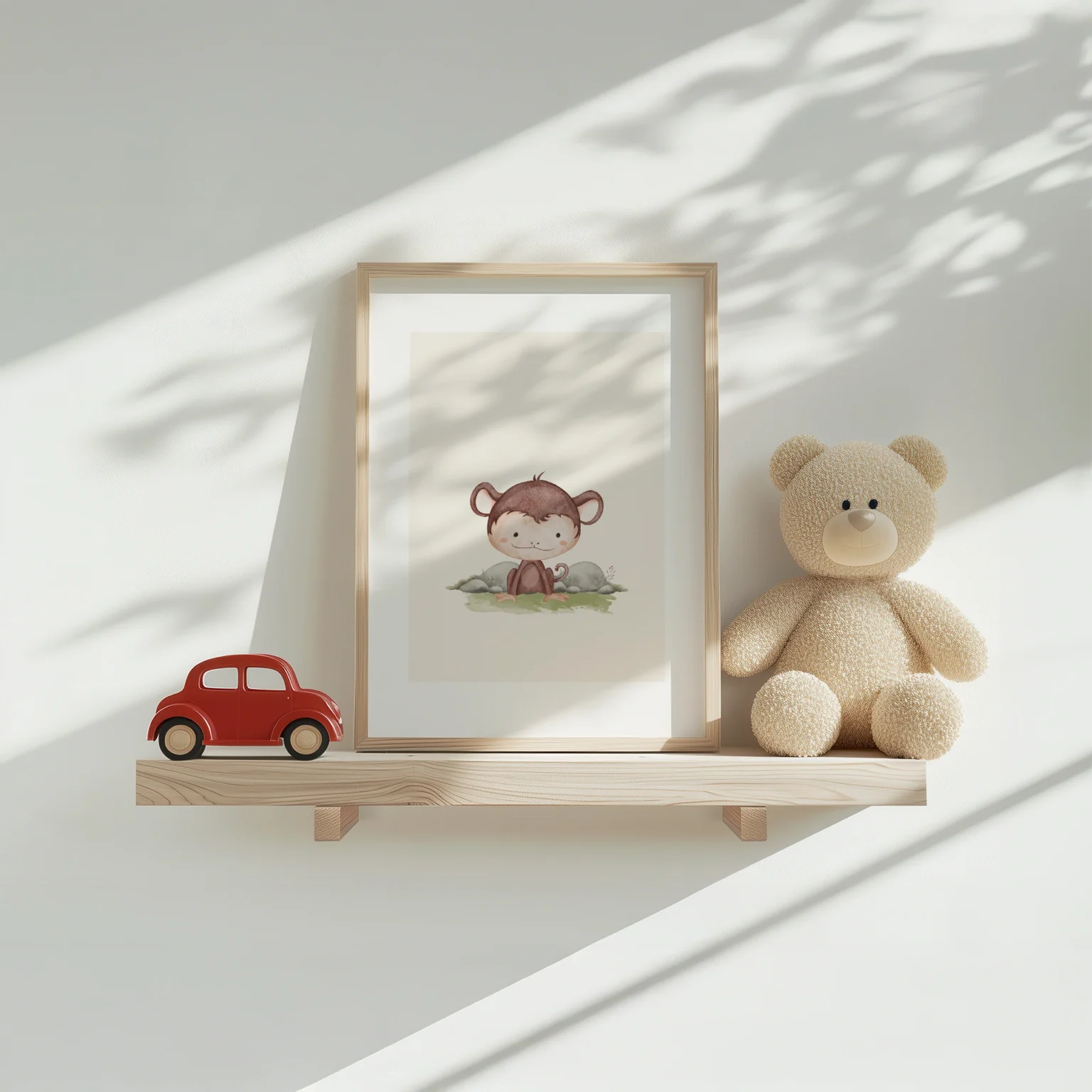 Maymun Kardeş, pastel renkli dost canlısı duruşuyla çocuk odalarına neşe katar; çerçeveli tablo veya poster olarak duvarlarınıza eşlik eder.