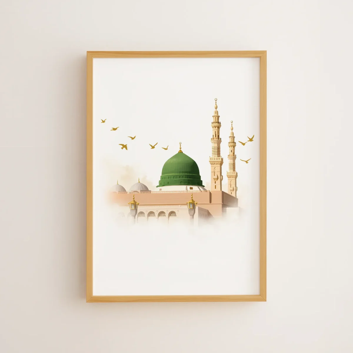 Bulutlar üzerinde süzülen Mescid-i Nebevî’nin o huzur veren yeşil kubbesi ve minareleriyle, manevi bir yolculuğa davet eden bu tasarım, çerçeveli tablo veya poster olarak sunulur.