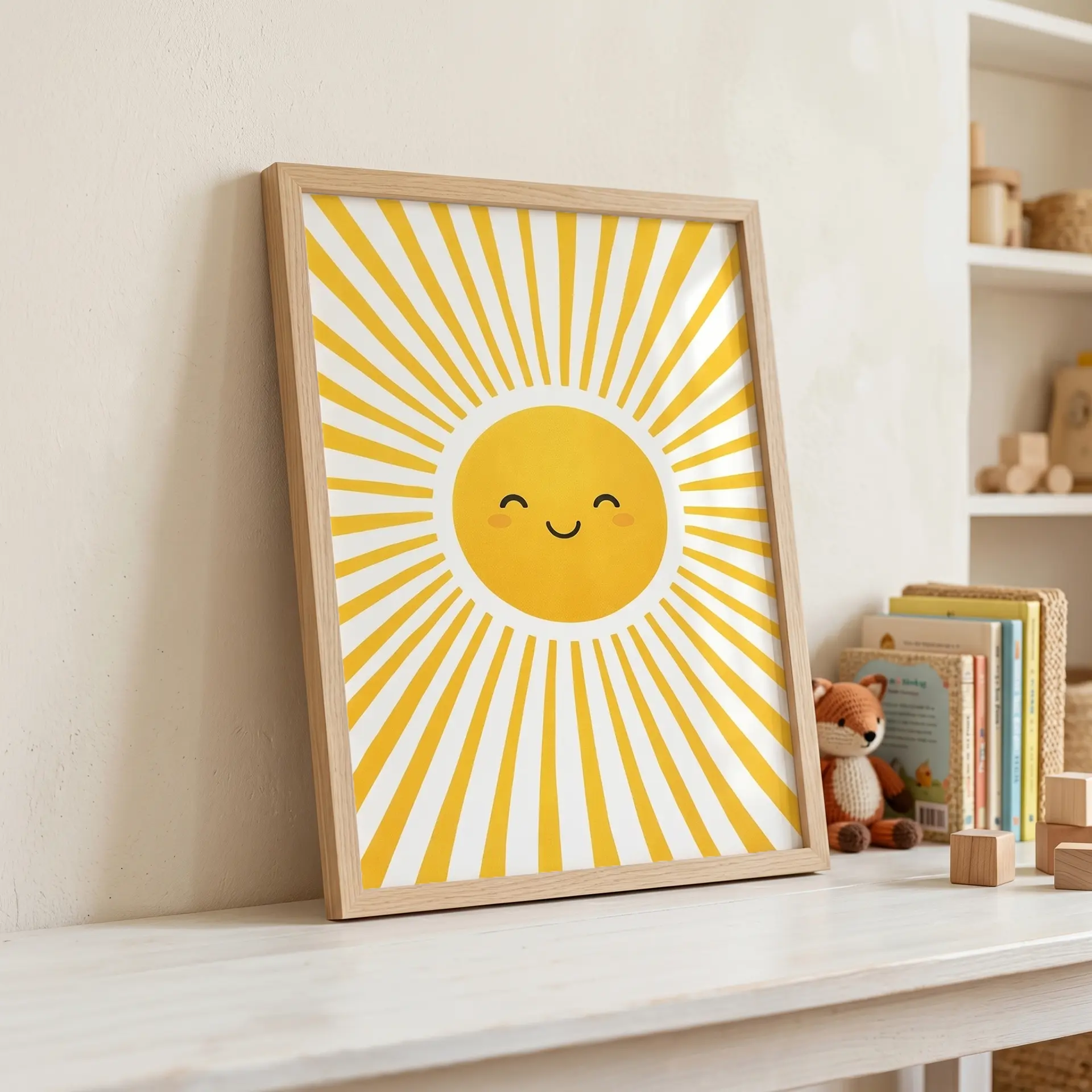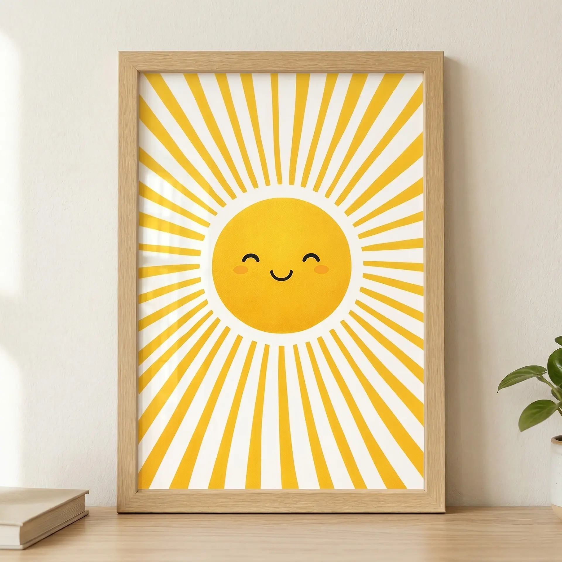 Mutlu güneş çocuk odası çerçeveli tablosu, neşeli gülümsemesiyle miniklerin odasına canlılık, sıcaklık ve enerji katıyor.