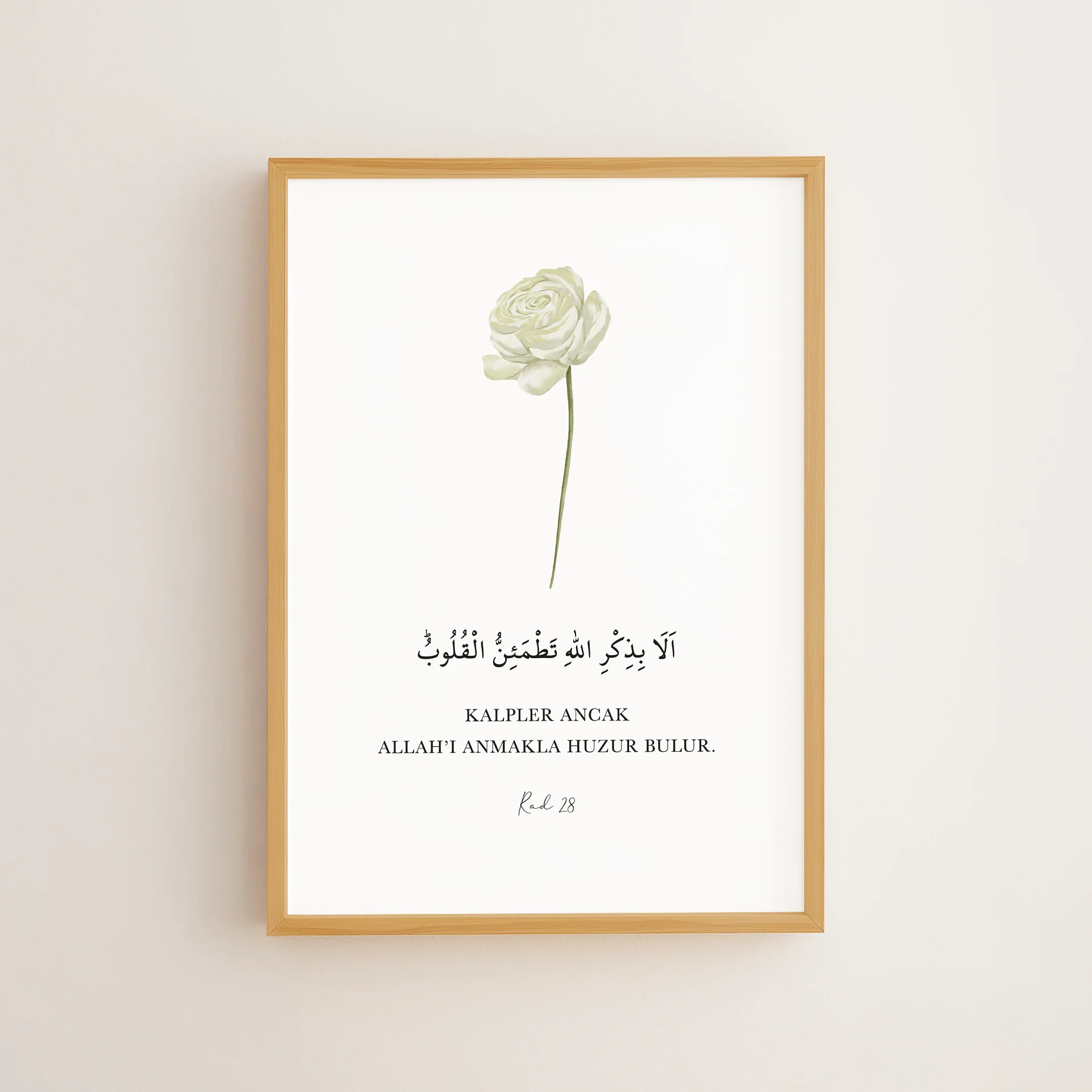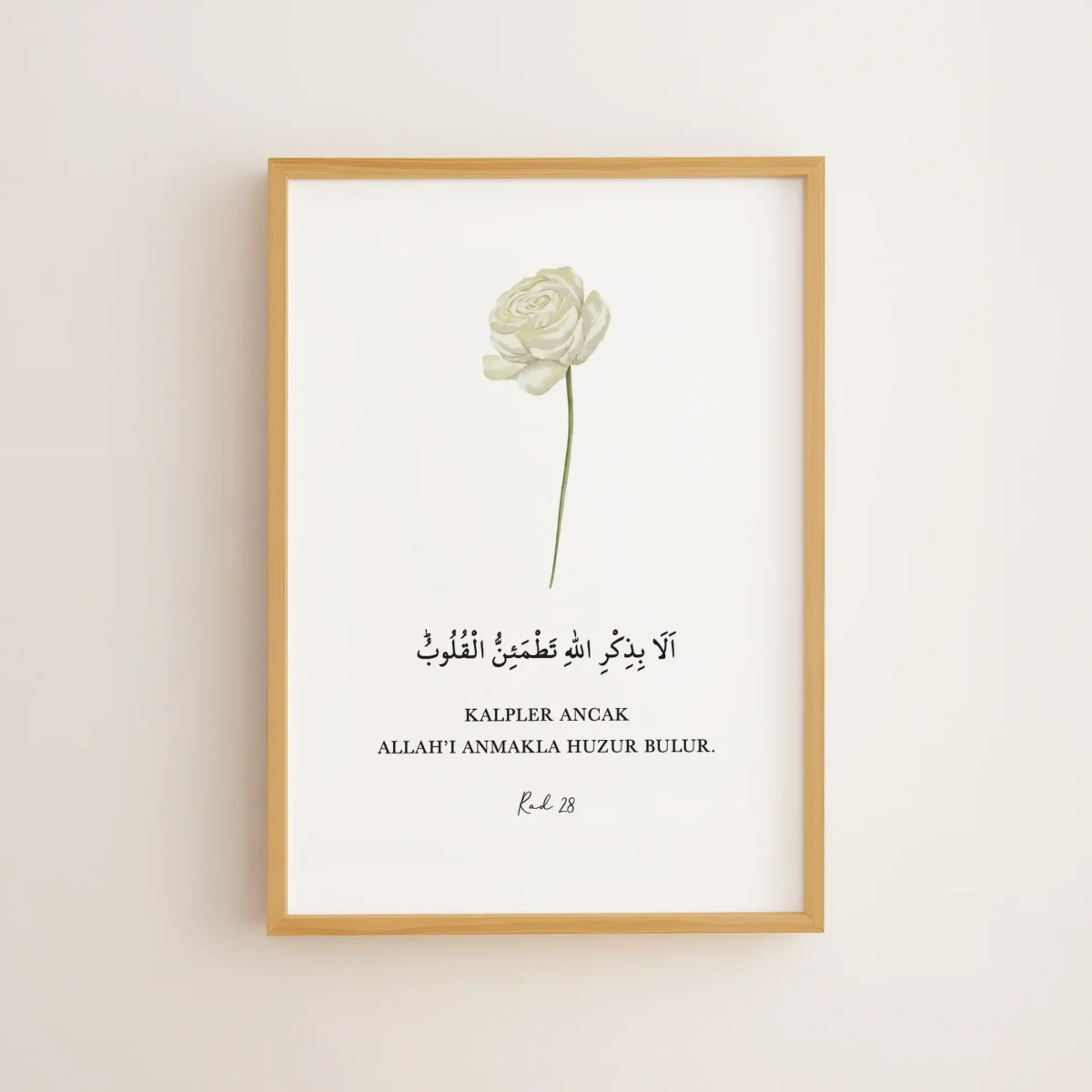 R’ad 28, “Kalpler ancak Allah’ı anmakla huzur bulur” ayetini sakin yeşil tonlardaki bir gül ile birleştirir. Çerçeveli tablo veya poster olarak, manevi dinginliği ve huzuru yaşam alanınıza taşır.