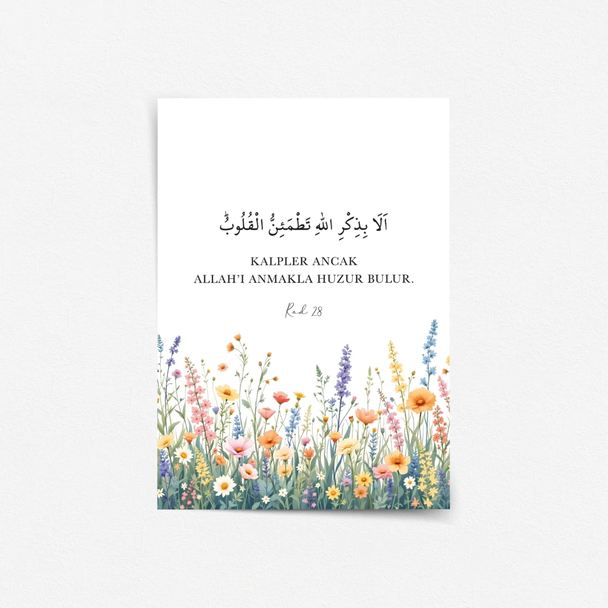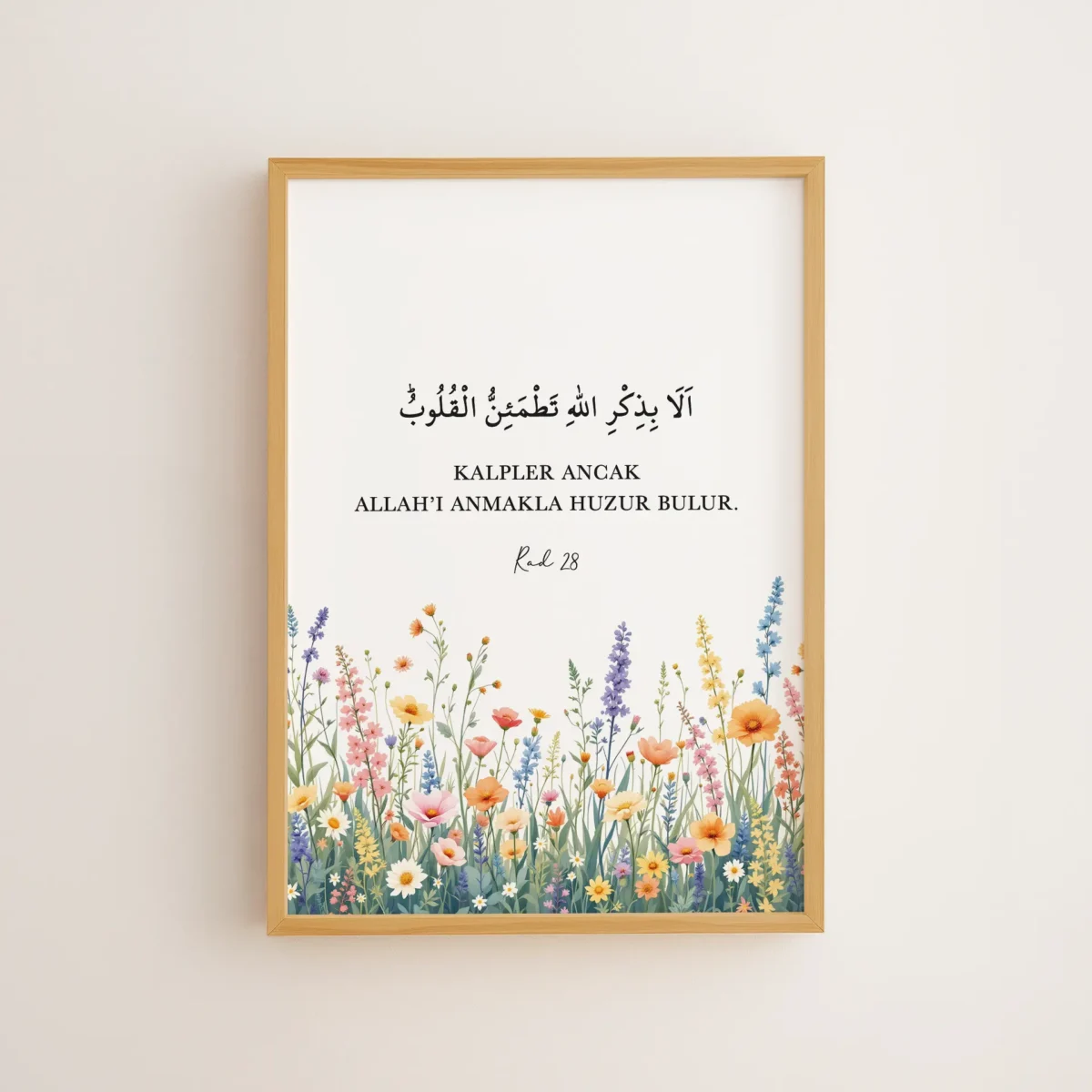Pastel çiçeklerden oluşan bu tasarım, “Kalpler ancak Allah’ı anmakla huzur bulur” ayetini ferah bir üslupla sunar. Çerçeveli tablo veya poster olarak dinginlik katar.