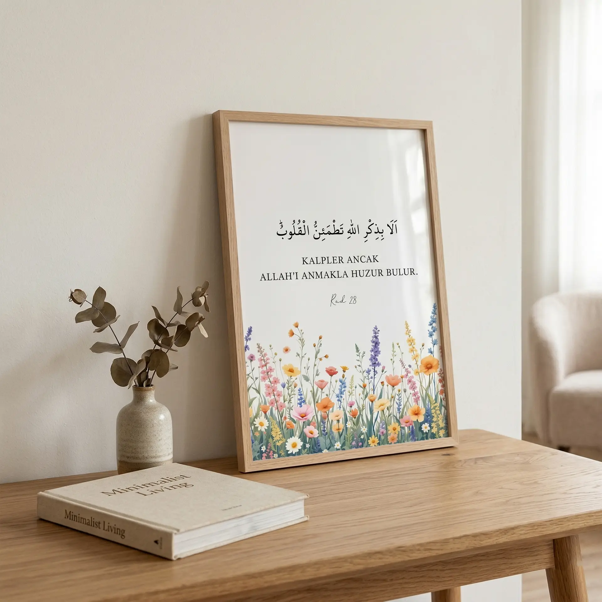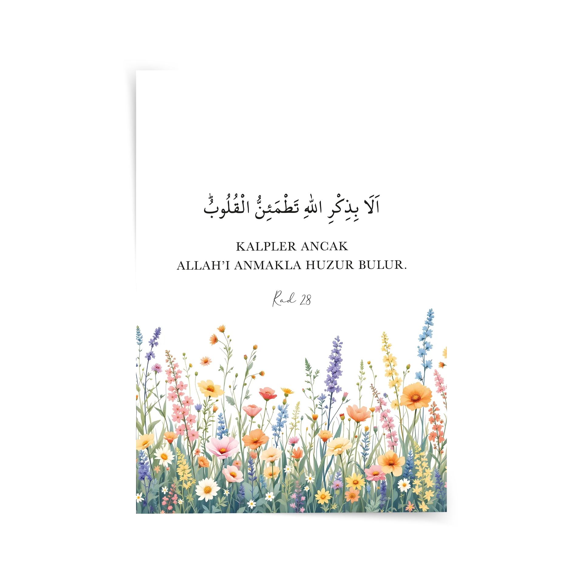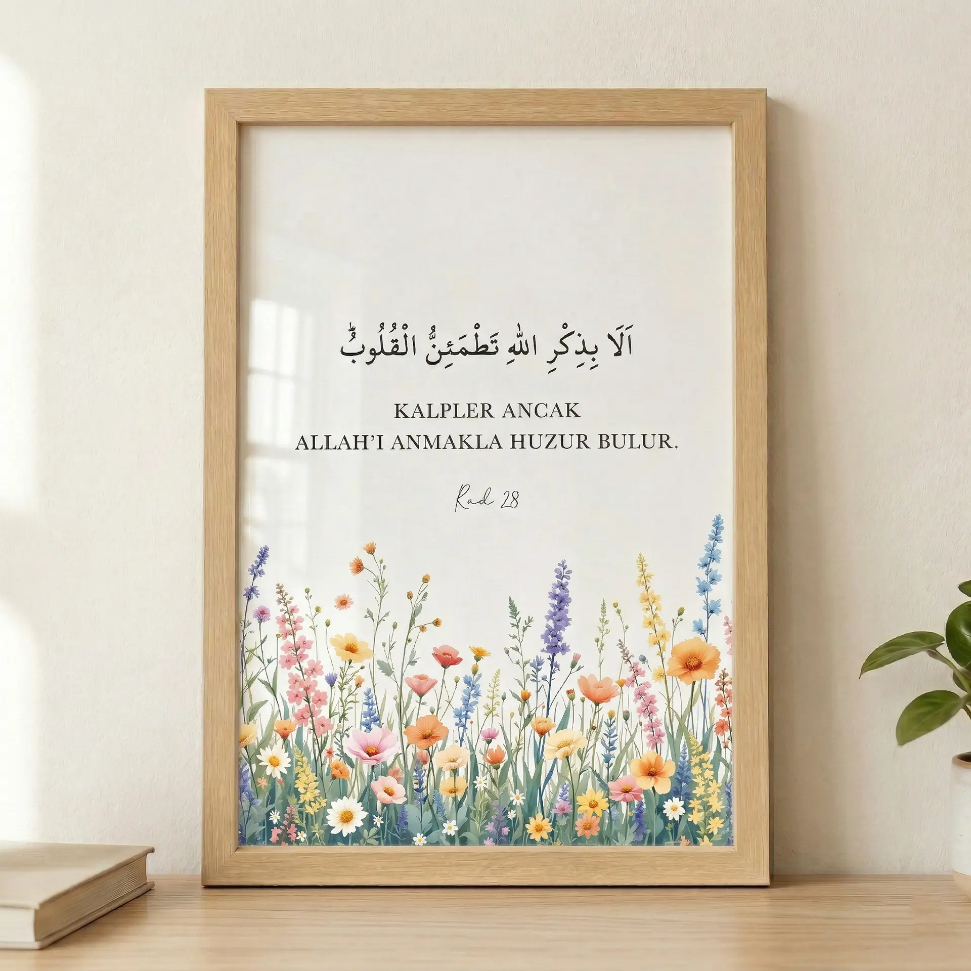 Pastel çiçeklerden oluşan bu tasarım, “Kalpler ancak Allah’ı anmakla huzur bulur” ayetini ferah bir üslupla sunar. Çerçeveli tablo veya poster olarak dinginlik katar.